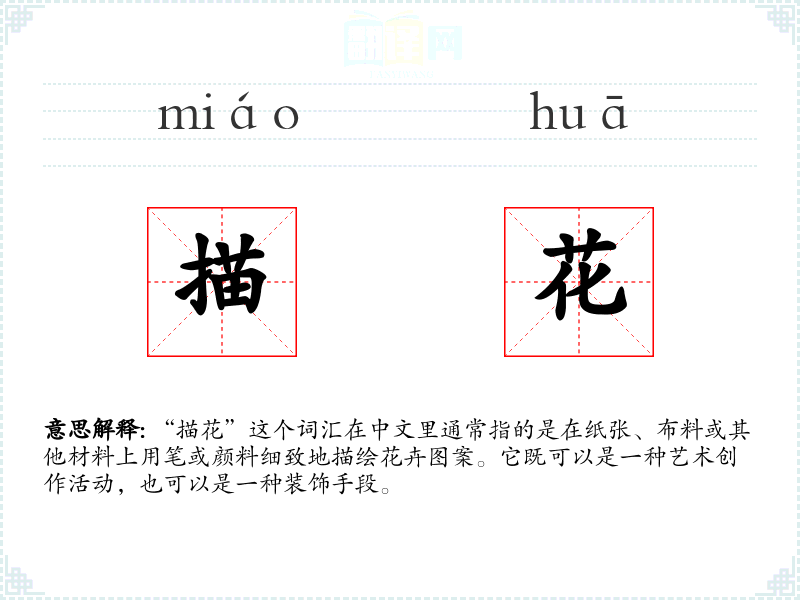 “描花”这个词汇在中文里通常指的是在纸张、布料或其他材料上用笔或颜料细致地描绘花卉图案。它既可以是一种艺术创作活动,也可以是一种装饰手段。