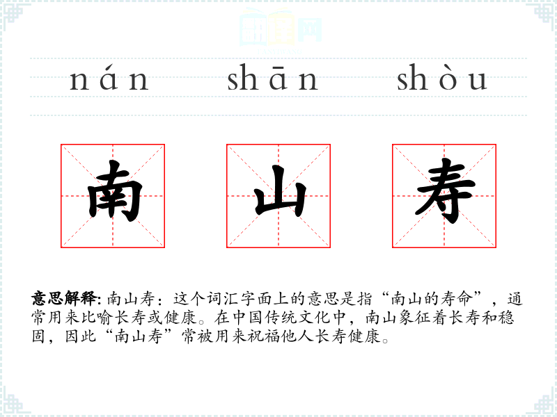 南山寿:这个词汇字面上的意思是指“南山的寿命”,通常用来比喻长寿或健康。在**传统文化中,南山象征着长寿和稳固,因此“南山寿”常被用来祝福他人长寿健康。
