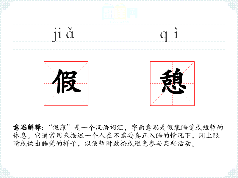 “假寐”是一个汉语词汇,字面意思是假装睡觉或短暂的休息。它通常用来描述一个人在不需要真正入睡的情况下,闭上眼睛或做出睡觉的样子,以便暂时放松或避免参与某些活动。
