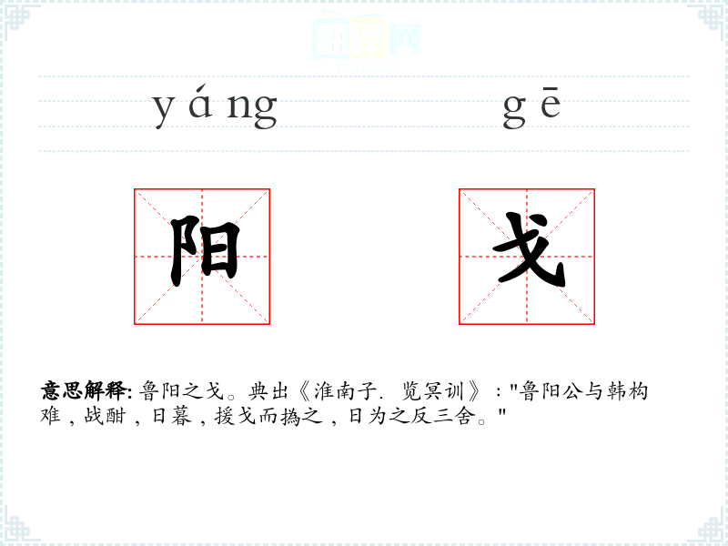 鲁阳之戈。典出《淮南子.览冥训》﹕"鲁阳公与韩构难﹐战酣﹐日暮﹐援戈而撝之﹐日为之反三舍。"