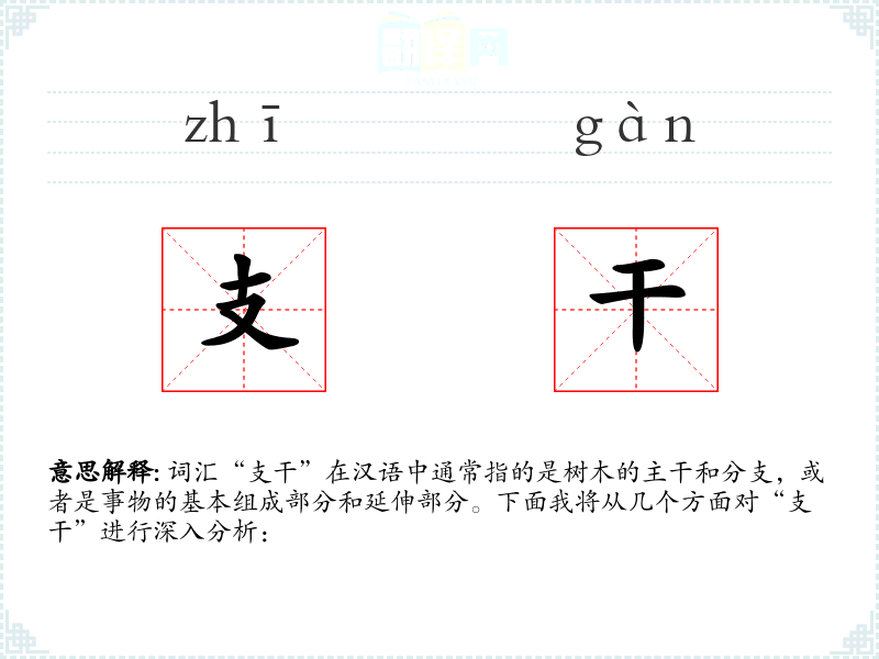 词汇“支干”在汉语中通常指的是树木的主干和分支,或者是事物的基本组成部分和延伸部分。下面我将从几个方面对“支干”进行深入分析: