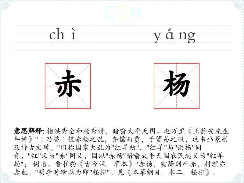 1.指洪秀全和杨秀清,暗喻太平天国。赵万里《王静安先生年谱》"﹝乃誉﹞值赤杨之乱,弃儒而贾,于贸易之暇,攻书画篆刻及诗古文辞。"旧称国家大乱为"红羊劫","红羊"与"洪杨"同音,"红"又与"赤"同义,因以"赤杨"暗喻太平天国农民起义为"红羊劫"; 树名。晋崔豹《古今注.草本》"赤杨,霜降则叶赤,材理亦赤也。"明李时珍以为即"柽柳"。见《本草纲目.木二.柽柳》。