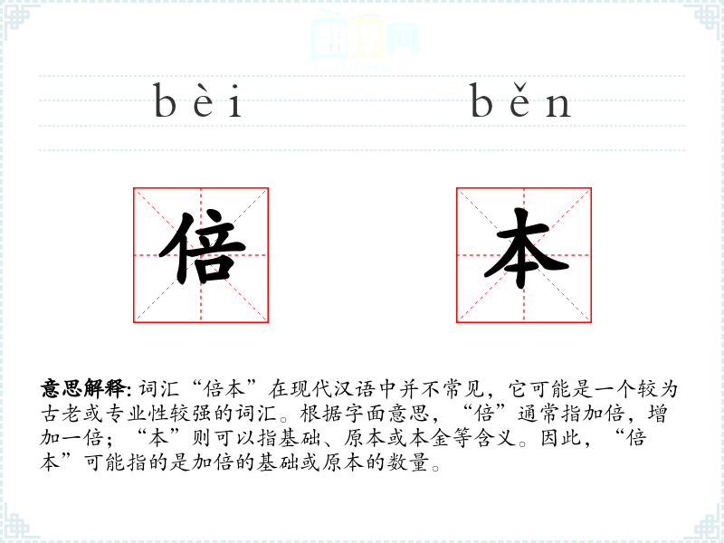 词汇“倍本”在现代汉语中并不常见,它可能是一个较为古老或专业性较强的词汇。根据字面意思,“倍”通常指加倍,增加一倍;“本”则可以指基础、原本或本金等含义。因此,“倍本”可能指的是加倍的基础或原本的数量。