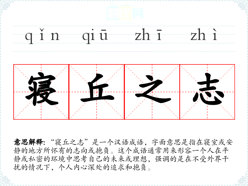 在文学作品中,“寝丘之志”常用来描绘主人公在孤独或静谧的环境中反思人生,规划未来。在口语中,这个成语可能不太常用,但在某些正式或文学性较强的对话中,仍可用来表达深层次的思考和抱负。在专业领域,如心理学或哲学讨论中,这个词汇可能被用来探讨个人内在动机和目标。