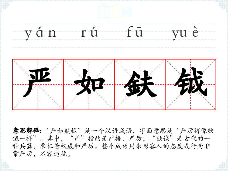 “严如鈇钺”是一个汉语成语,字面意思是“严厉得像铁钺一样”。其中,“严”指的是严格、严厉,“鈇钺”是古代的一种兵器,象征着权威和严厉。整个成语用来形容人的态度或行为非常严厉,不容违抗。
