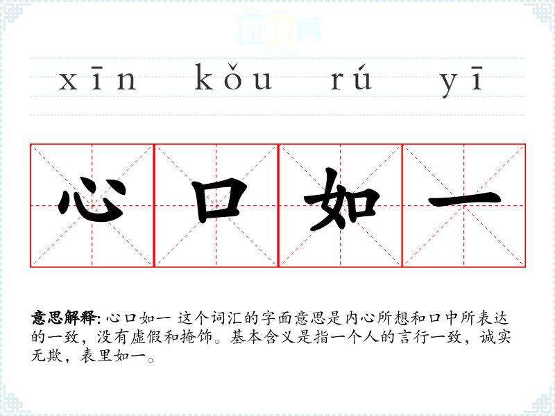 心口如一 这个词汇的字面意思是内心所想和口中所表达的一致,没有虚假和掩饰。基本含义是指一个人的言行一致,诚实无欺,表里如一。
