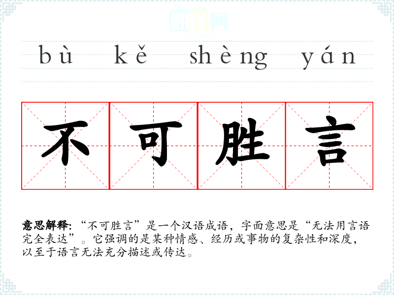 “不可胜言”是一个汉语成语,字面意思是“无法用言语完全表达”。它强调的是某种情感、经历或事物的复杂性和深度,以至于语言无法充分描述或传达。