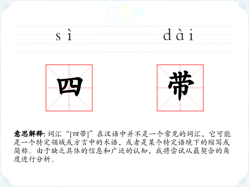 由于“[四带]”不是一个标准词汇,我们无法给出确切的字面意思和基本含义。它可能是某个特定领域(如扑克牌游戏中的术语,表示四张相同点数的牌带一对其他牌)或方言中的词汇。