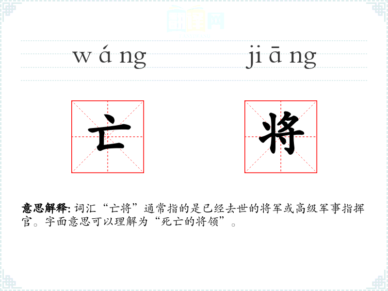 词汇“亡将”通常指的是已经去世的将军或高级军事指挥官。字面意思可以理解为“死亡的将领”。