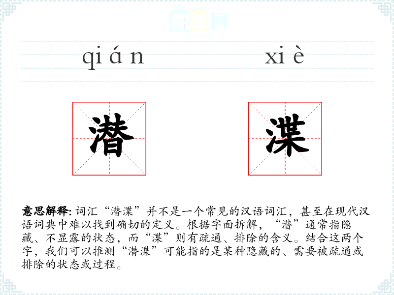 词汇“潜渫”并不是一个常见的汉语词汇,甚至在现代汉语词典中难以找到确切的定义。根据字面拆解,“潜”通常指隐藏、不显露的状态,而“渫”则有疏通、排除的含义。结合这两个字,我们可以推测“潜渫”可能指的是某种隐藏的、需要被疏通或排除的状态或过程。
