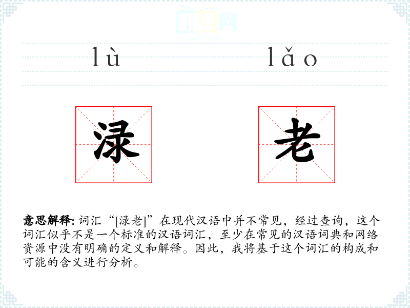 词汇“[渌老]”在现代汉语中并不常见,经过查询,这个词汇似乎不是一个标准的汉语词汇,至少在常见的汉语词典和网络资源中没有明确的定义和解释。因此,我将基于这个词汇的构成和可能的含义进行分析。