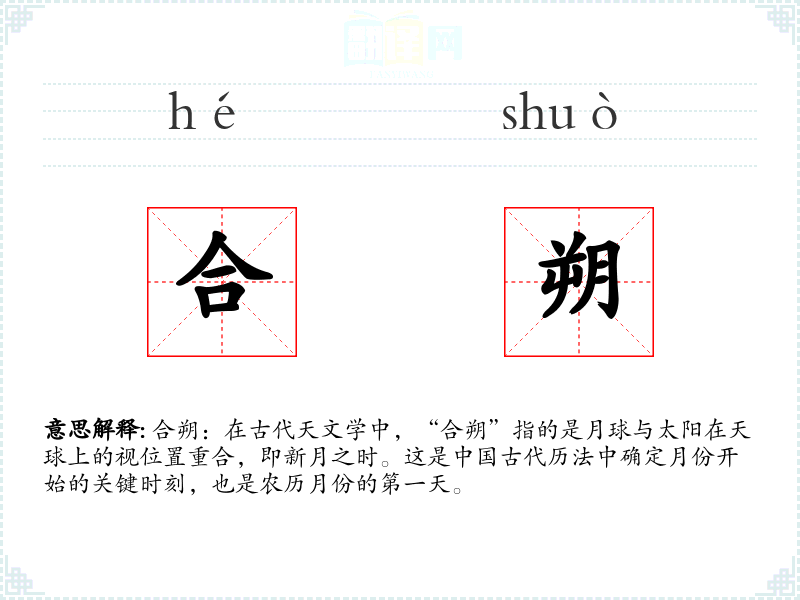 文学:在古典文学中,“合朔”常用于描述时间的循环和自然的规律,如“岁岁合朔,月月盈亏”。 口语:在现代口语中,“合朔”不常用,更多使用“新月”或“初一”来表示。 专业领域:在天文学和历法学中,“合朔”是一个专业术语,用于精确描述月球和太阳的相对位置。
