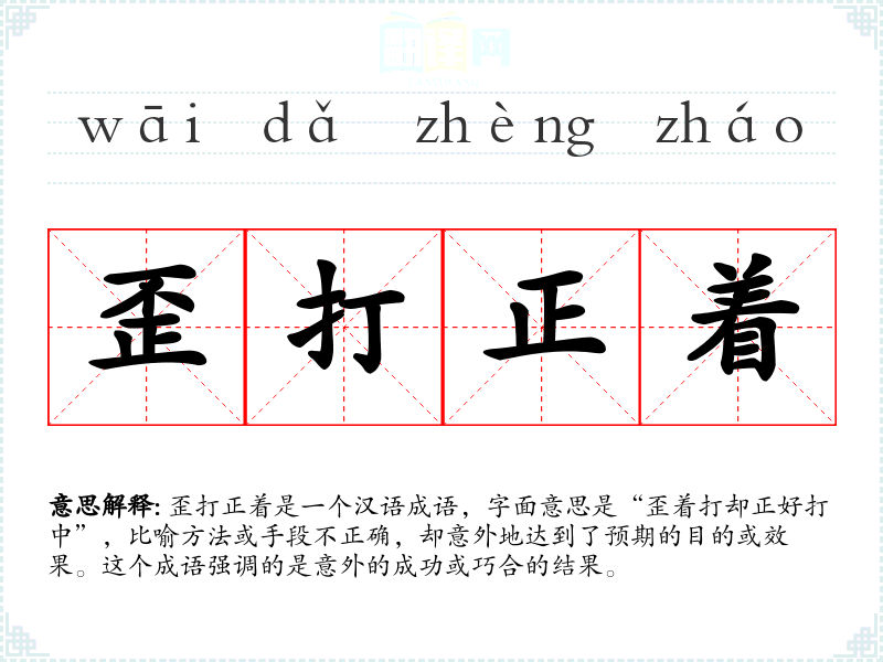 歪打正着是一个汉语成语,字面意思是“歪着打却正好打中”,比喻方法或手段不正确,却意外地达到了预期的目的或效果。这个成语强调的是意外的成功或巧合的结果。