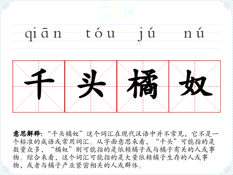 “千头橘奴”这个词汇虽然不是一个常用词汇,但它提供了一个有趣的视角来探讨特定群体的生活方式和生存状态。在语言学习和表达中,了解和掌握这样的词汇可以帮助我们更深入地理解不同的文化和生活现象。