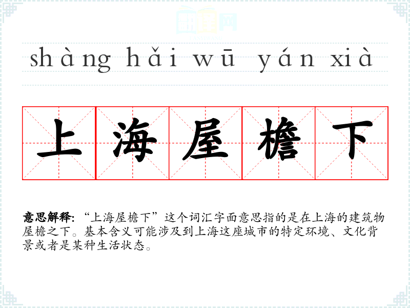 “上海屋檐下”这个词汇字面意思指的是在上海的建筑物屋檐之下。基本含义可能涉及到上海这座城市的特定环境、文化背景或者是某种生活状态。