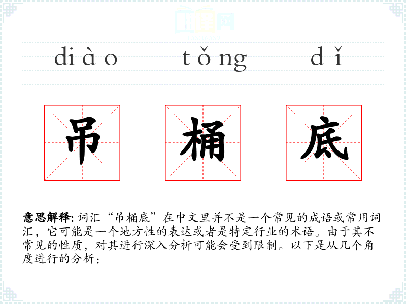 由于“吊桶底”不是一个广泛使用的词汇,它在不同语境下的使用可能非常有限。在某些地方方言或特定行业中,它可能指的是吊桶的底部部分,或者可能有一种特定的含义或用法,但这需要具体的语境来确定。