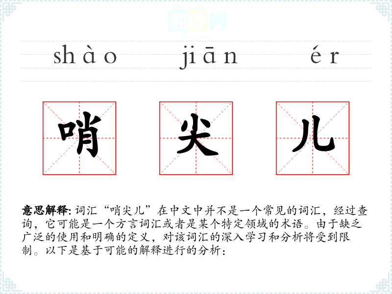 词汇“哨尖儿”在中文中并不是一个常见的词汇,经过查询,它可能是一个方言词汇或者是某个特定领域的术语。由于缺乏广泛的使用和明确的定义,对该词汇的深入学习和分析将受到限制。以下是基于可能的解释进行的分析: