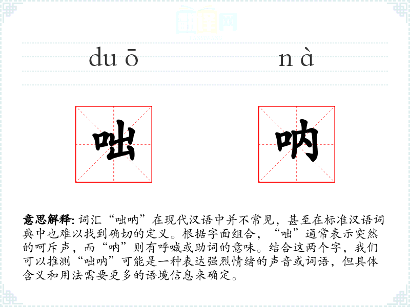 词汇“咄呐”在现代汉语中并不常见,甚至在标准汉语词典中也难以找到确切的定义。根据字面组合,“咄”通常表示突然的呵斥声,而“呐”则有呼喊或助词的意味。结合这两个字,我们可以推测“咄呐”可能是一种表达强烈情绪的声音或词语,但具体含义和用法需要更多的语境信息来确定。