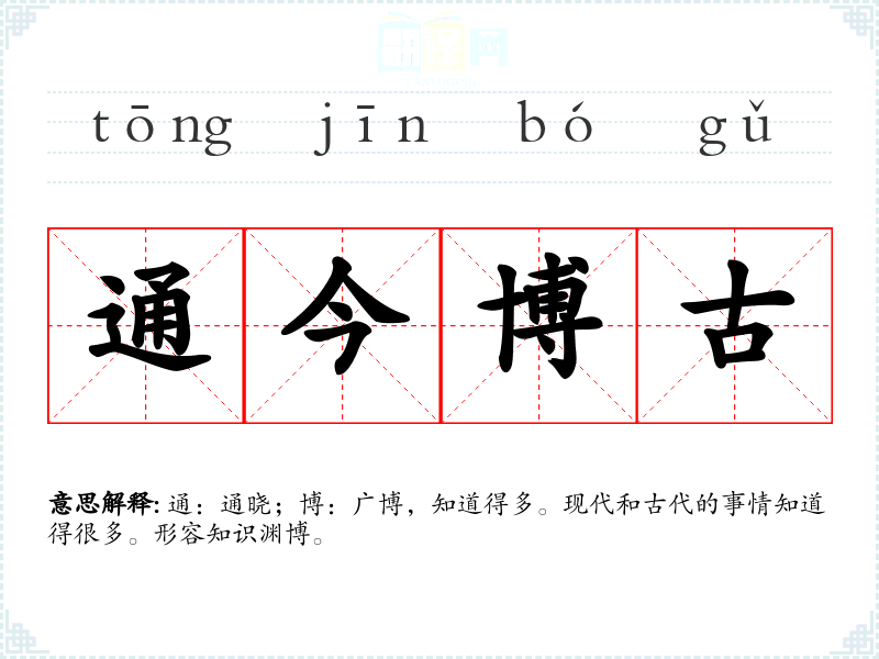 通:通晓;博:广博,知道得多。现代和古代的事情知道得很多。形容知识渊博。