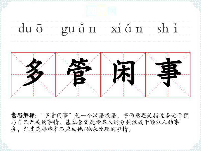 “多管闲事”是一个汉语成语,字面意思是指过多地干预与自己无关的事情。基本含义是指某人过分关注或干预他人的事务,尤其是那些本不应由他/她来处理的事情。