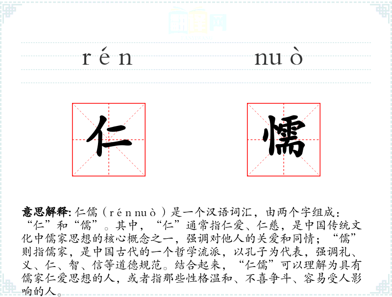 仁儒(rén nuò)是一个汉语词汇,由两个字组成:“仁”和“儒”。其中,“仁”通常指仁爱、仁慈,是传统文化中儒家思想的核心概念之一,强调对他人的关爱和同情;“儒”则指儒家,是古代的一个哲学流派,以孔子为代表,强调礼、义、仁、智、信等道德规范。结合起来,“仁儒”可以理解为具有儒家仁爱思想的人,或者指那些性格温和、不喜争斗、容易受人影响的人。