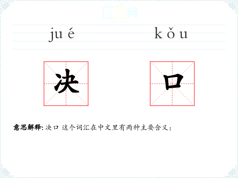 决口 的词源较为直接,由“决”(破裂)和“口”(开口)组成。在古代文献中,如《史记》等,已有使用决口描述堤坝破裂的记载。随着语言的发展,其比喻意义逐渐被广泛接受。
