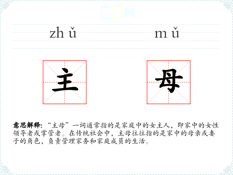 “主母”一词通常指的是家庭中的女主人,即家中的女性领导者或掌管者。在传统社会中,主母往往指的是家中的母亲或妻子的角色,负责管理家务和家庭成员的生活。