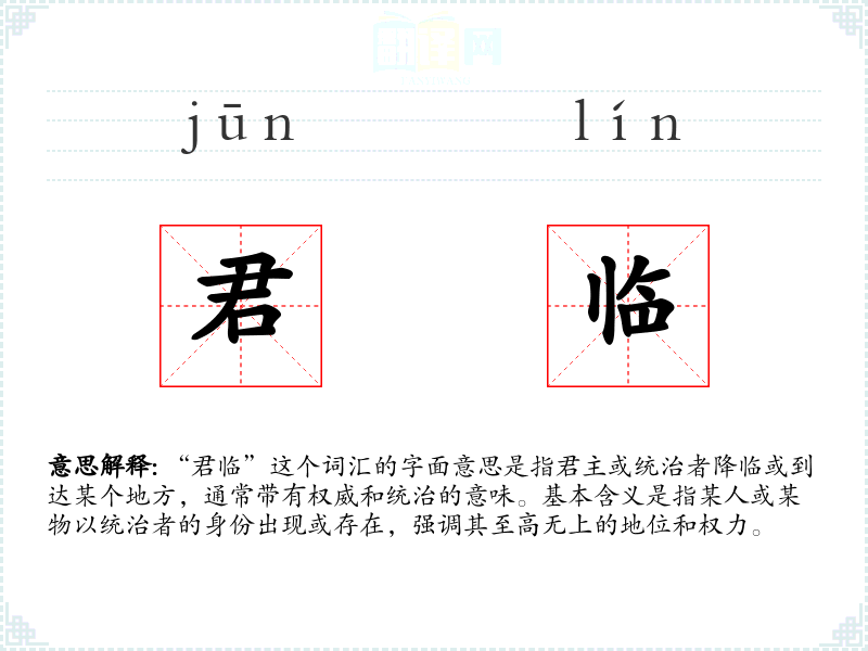 “君临”这个词汇的字面意思是指君主或统治者降临或到达某个地方,通常带有权威和统治的意味。基本含义是指某人或某物以统治者的身份出现或存在,强调其至高无上的地位和权力。