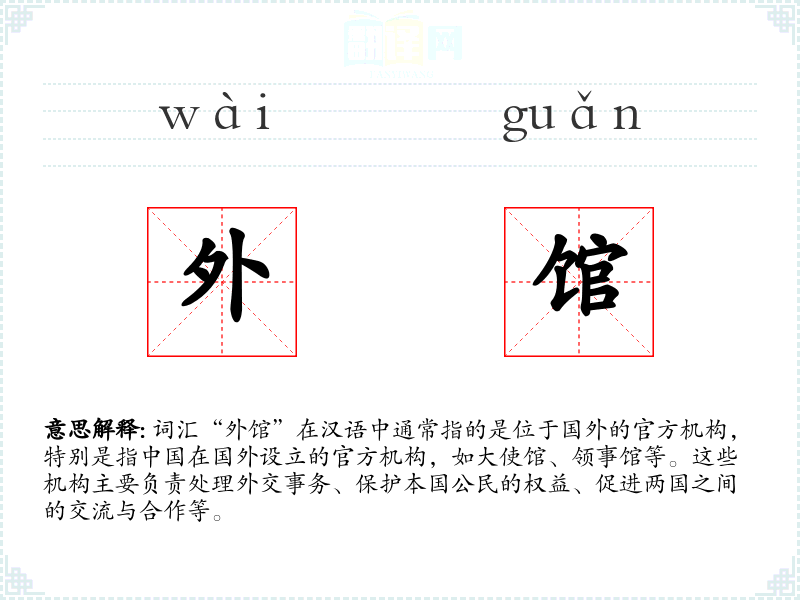 - 反义词:内馆(指国内的官方机构)