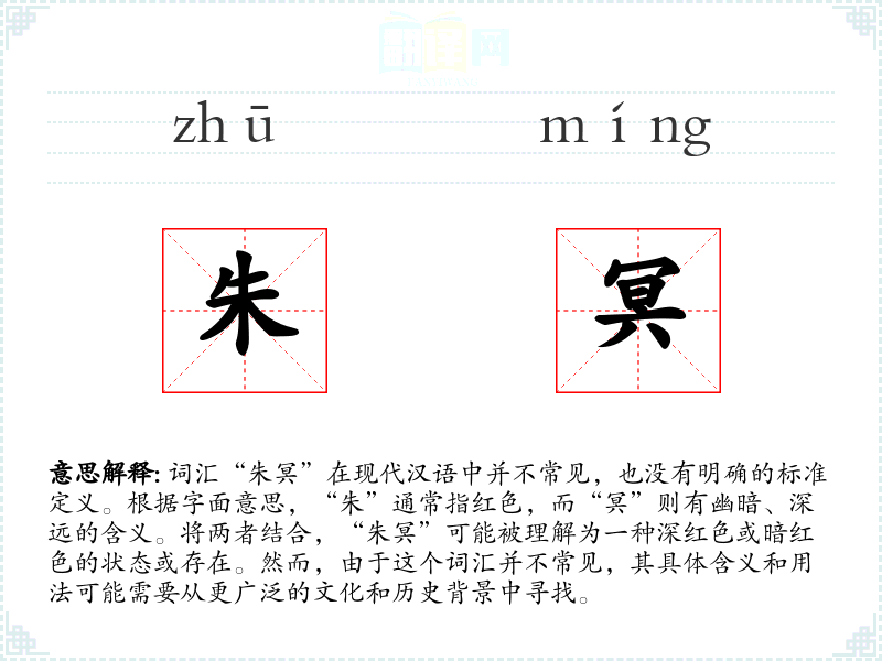 词汇“朱冥”在现代汉语中并不常见,也没有明确的标准定义。根据字面意思,“朱”通常指红色,而“冥”则有幽暗、深远的含义。将两者结合,“朱冥”可能被理解为一种深红色或暗红色的状态或存在。然而,由于这个词汇并不常见,其具体含义和用法可能需要从更广泛的文化和历史背景中寻找。
