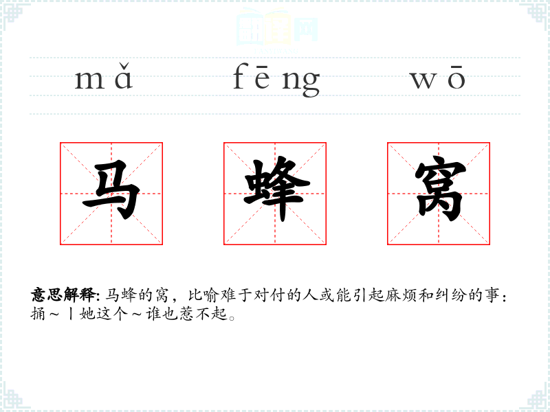 马蜂的窝,比喻难于对付的人或能引起麻烦和纠纷的事:捅~丨她这个~谁也惹不起。