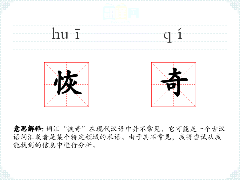 词汇“恢奇”在现代汉语中并不常见,它可能是一个古汉语词汇或者是某个特定领域的术语。由于其不常见,我将尝试从我能找到的信息中进行分析。