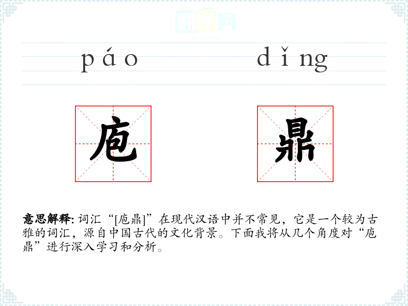 “庖鼎”一词由两个汉字组成:“庖”和“鼎”。