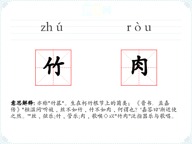 亦称"竹菰"。生在朽竹根节上的菌类; 《晋书.孟嘉传》"桓温问'听妓﹐丝不如竹﹐竹不如肉﹐何谓也?'嘉答曰'渐近使之然。'"丝﹐弦乐;竹﹐管乐;肉﹐歌喉◇以"竹肉"泛指器乐与歌唱。