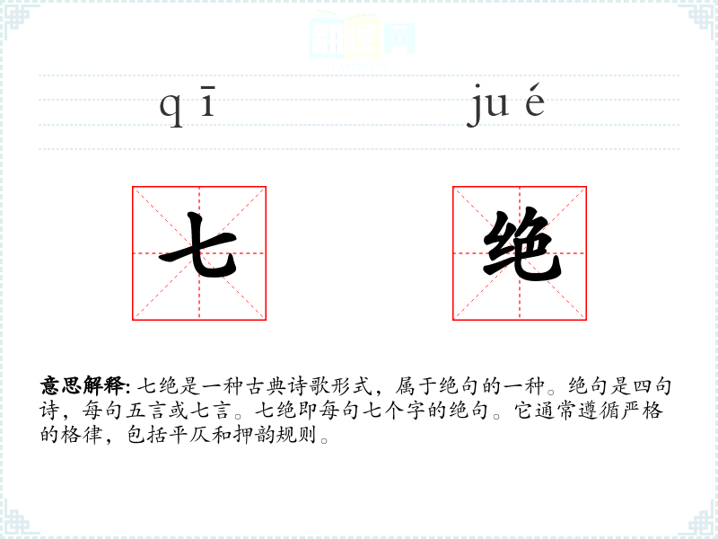七绝是一种古典诗歌形式,属于绝句的一种。绝句是四句诗,每句五言或七言。七绝即每句七个字的绝句。它通常遵循严格的格律,包括平仄和押韵规则。