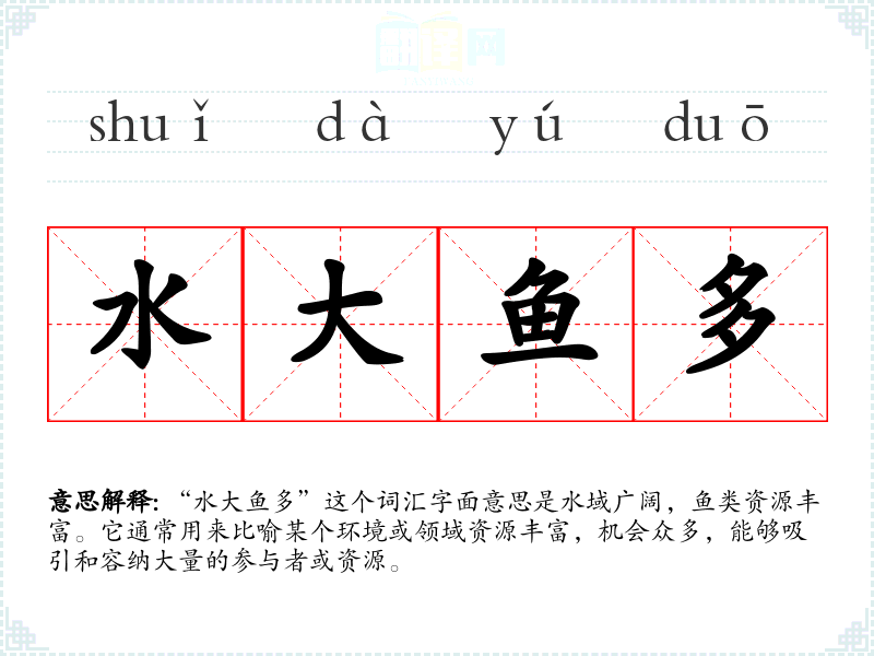 “水大鱼多”这个词汇字面意思是水域广阔,鱼类资源丰富。它通常用来比喻某个环境或领域资源丰富,机会众多,能够吸引和容纳大量的参与者或资源。