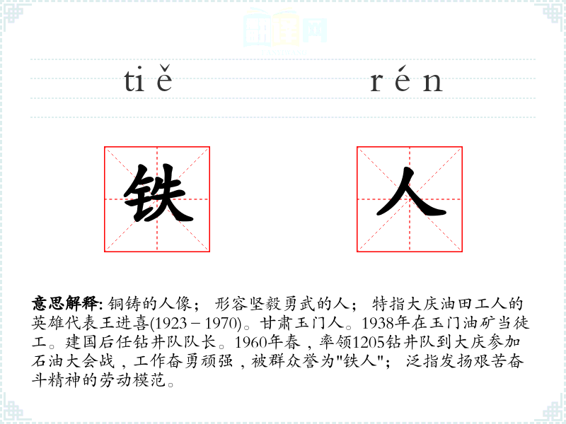 1.铜铸的人像; 形容坚毅勇武的人; 特指大庆油田工人的英雄代表王进喜(1923-1970)。甘肃玉门人。1938年在玉门油矿当徒工。建国后任钻井队队长。1960年春﹐率领1205钻井队到大庆参加石油大会战﹐工作奋勇顽强﹐被群众誉为"铁人"; 泛指发扬艰苦奋斗精神的劳动模范。