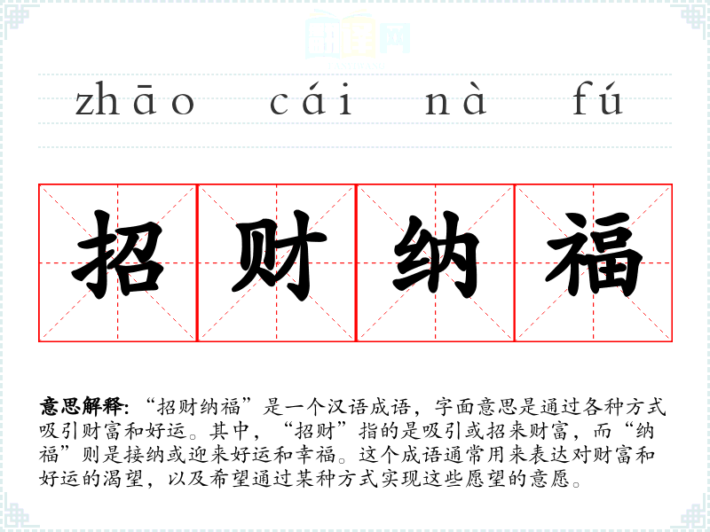 “招财纳福”是一个汉语成语,字面意思是通过各种方式吸引财富和好运。其中,“招财”指的是吸引或招来财富,而“纳福”则是接纳或迎来好运和幸福。这个成语通常用来表达对财富和好运的渴望,以及希望通过某种方式实现这些愿望的意愿。