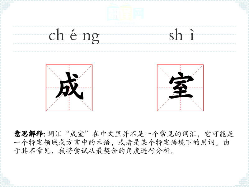 词汇“成室”在中文里并不是一个常见的词汇,它可能是一个特定领域或方言中的术语,或者是某个特定语境下的用词。由于其不常见,我将尝试从最契合的角度进行分析。