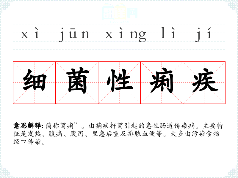 简称菌痢”。由痢疾杆菌引起的急性肠道传染病。主要特征是发热、腹痛、腹泻、里急后重及排脓血便等。大多由污染食物经口传染。