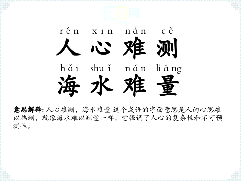 人心难测,海水难量 这个成语的字面意思是人的心思难以揣测,就像海水难以测量一样。它强调了人心的复杂性和不可预测性。