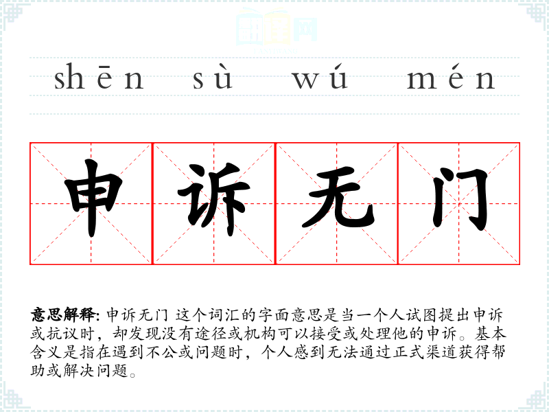 申诉无门 这个词汇的字面意思是当一个人试图提出申诉或抗议时,却发现没有途径或机构可以接受或处理他的申诉。基本含义是指在遇到不公或问题时,个人感到无法通过正式渠道获得帮助或解决问题。