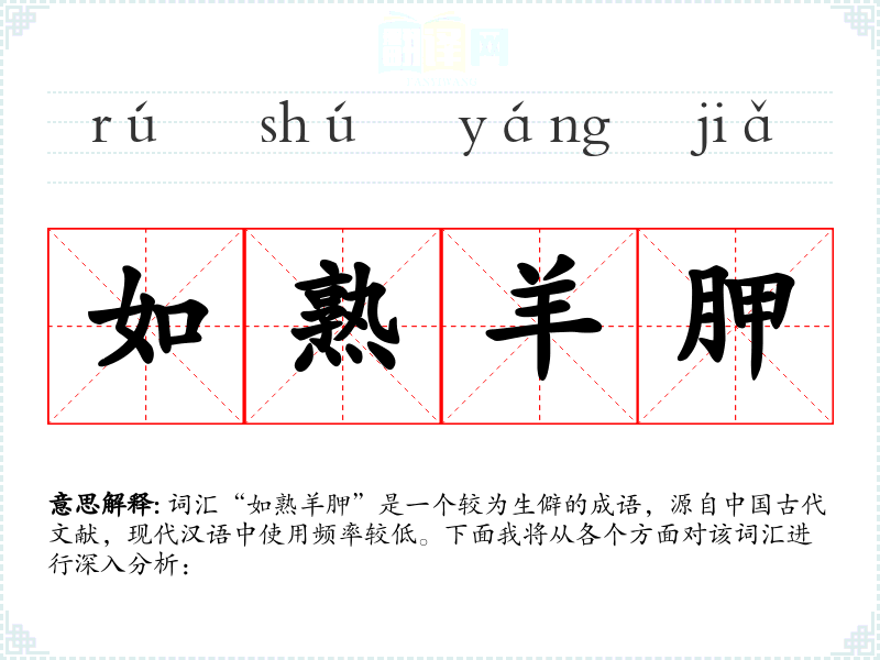 词汇“如熟羊胛”是一个较为生僻的成语,源自**古代文献,现代汉语中使用频率较低。下面我将从各个方面对该词汇进行深入分析: