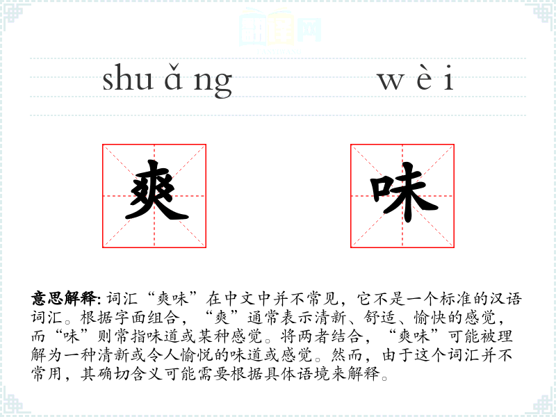 词汇“爽味”在中文中并不常见,它不是一个标准的汉语词汇。根据字面组合,“爽”通常表示清新、舒适、愉快的感觉,而“味”则常指味道或某种感觉。将两者结合,“爽味”可能被理解为一种清新或令人愉悦的味道或感觉。然而,由于这个词汇并不常用,其确切含义可能需要根据具体语境来解释。