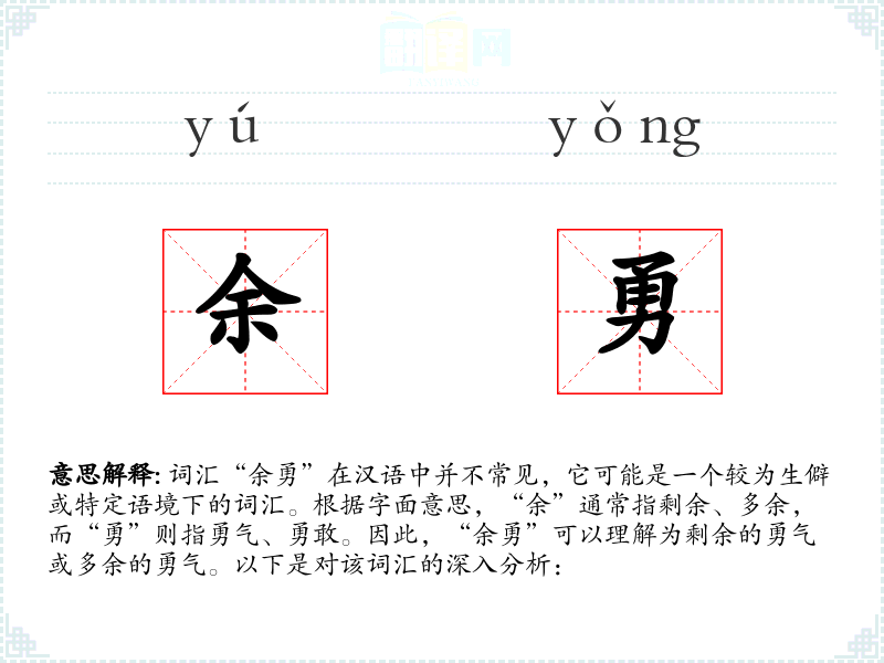 - 词源:“余勇”可能是由“余”和“勇”两个字组合而成,这两个字在古代汉语中都有明确的意义。