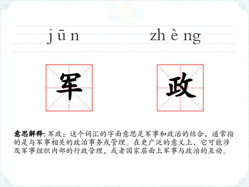 军政:这个词汇的字面意思是军事和政治的结合,通常指的是与军事相关的政治事务或管理。在更广泛的意义上,它可能涉及军事组织内部的行政管理,或者国家层面上军事与政治的互动。