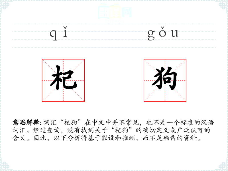 由于“杞狗”不是一个标准词汇,我们无法对其进行深入的分析和理解。在语言学*和表达中,重要的是关注那些有明确定义和广泛认可的词汇。对于不常见的词汇,我们应该谨慎使用,并在必要时进行详细的解释和说明。