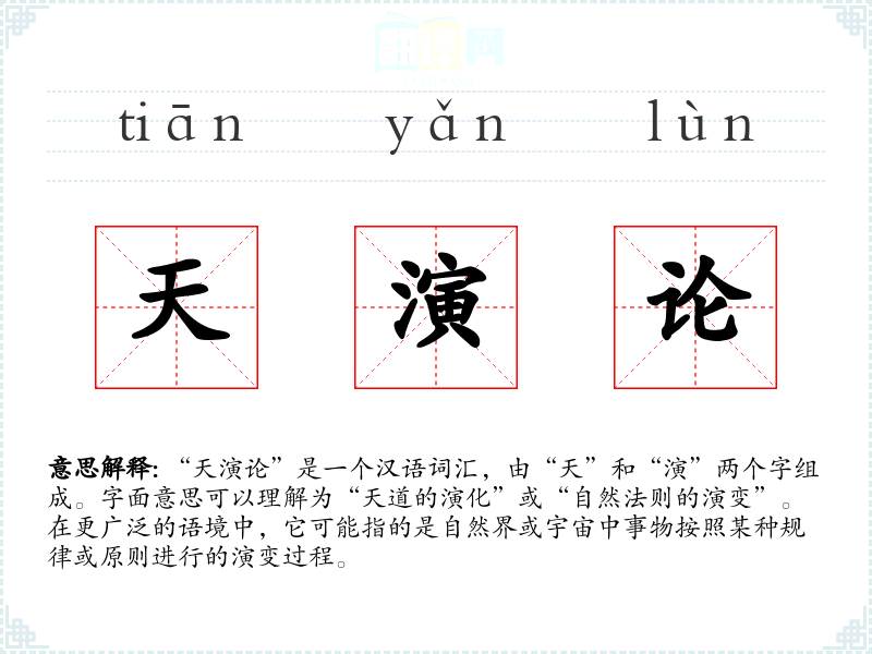 “天演论”是一个汉语词汇,由“天”和“演”两个字组成。字面意思可以理解为“天道的演化”或“自然法则的演变”。在更广泛的语境中,它可能指的是自然界或宇宙中事物按照某种规律或原则进行的演变过程。