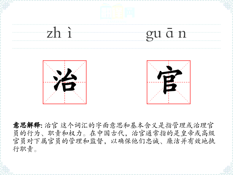 - 口语:在现代口语中,治官可能被用来指代政府对公务员的管理,或者公众对政府官员的监督。