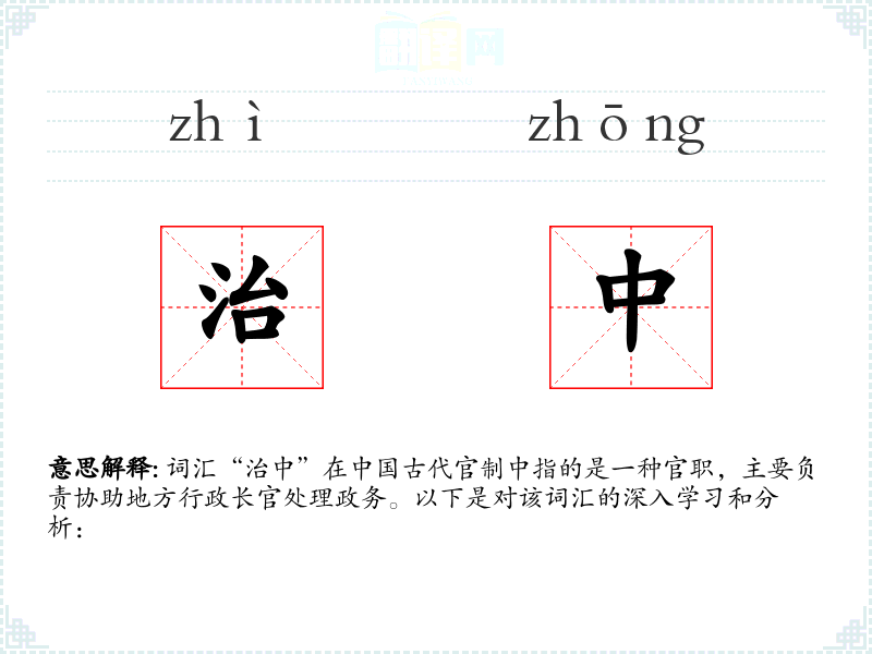 - 专业领域:在历史学、政治学和法律学等领域,研究古代官制时会涉及“治中”这一概念。